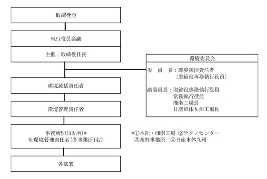 環境委員会を設置し、環境方針や目的・目標の展開、各部環境マネジメント計画の進捗状況確認、環境マネジメントシステムの見直し論議を行い、組織的な環境負荷低減活動を推進しております。環境委員会は環境統括責任者である取締役専務執行役員が委員長を務め、環境委員会の内容は取締役社長が議長を務める執行役員会議で定期的に報告しております。また、取締役会においても環境委員会での論議・決定事項を報告しております。